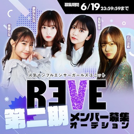 【主催】CHEERZ運営(フォッグ株式会社)2022年3月に第一期が終了した人気インフルエンサーガールズユニット『REVE』では、第二期オーディションを開催。参加者を募集している。高梨優佳、夢咲ももな、斉藤らな、石川涼楓の4名と第二期『REVE』を結成、活動していく。13歳~19歳の女性が対象。