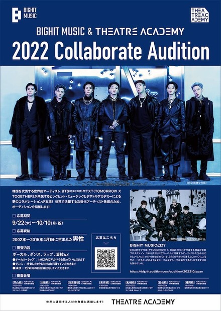 赤ちゃんから青年、シニアまで幅広く育成・マネージメントを手がけるテアトルアカデミーと、韓国の芸能プロダクションBIGHIT MUSICとのコラボオーディションが開催。参加者を募集している。BIGHIT MUSICには、BTS(防弾少年団)やTOMORROW X TOGETHERが所属。次世代アーティストの発掘を目指している。2002年~2015年4月1日に生まれた男性。
