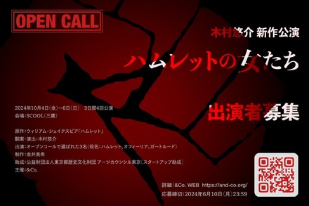 【主催】&Co.演出家、パフォーマーの木村悠介による2024年10月公演『ハムレットの女たち』(於:三鷹「SCOOL」)では出演者を募集している。合格者はハムレット、オフィーリア、ガートルードのいずれかを演じる。セクシャリティ、ジェンダー、年齢、身体能力、経験、すべて不問。