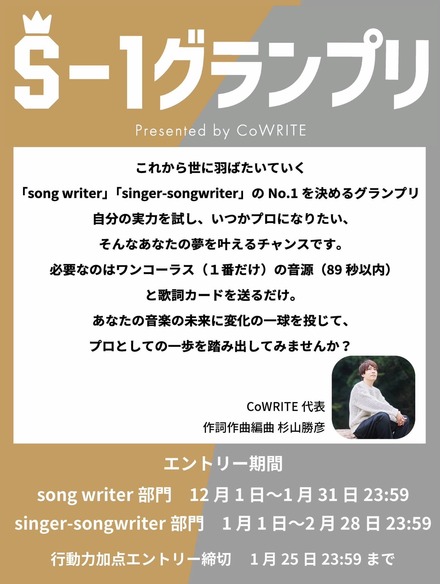 【主催】株式会社コライト音楽作家事務所 CoWRITE(コライト)では、「song writer」「singer-songwriter」のNo.1決定コンテスト「S-1 グランプリ」を開催。参加アーティスト/クリエイターを募集している。コライトは、乃木坂46・家入レオ・倖田來未などに楽曲提供実績を持つ作詞・作曲・編曲家の杉山勝彦氏が代表を務める音楽事務所。杉山氏をはじめ同事務所の作家・クリエイターが審査を行う。両部門ともワンコーラス(1番)の音源(89秒以内)と歌詞カードがあれば応募でき、上位入賞者にはプロデビューのチャンスがある。