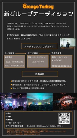 【主催】株式会社オレンジターキー開歌-かいか、PANDAMIC、セカイシティの所属するプロダクション「オレンジターキー」では、新アイドルグループメンバーオーディションを開催。参加者を募集している。サウンドプロデューサーを務めるのはミュージシャンの岡田典之(ex.空想委員会) 。歌が好き、踊るのが好き、アイドルに真剣に向き合いたい女性。13歳~25歳。