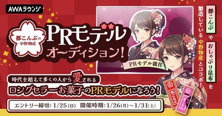 【主催】AWA株式会社サブスクリプション型(定額制)音楽ストリーミングサービスのAWA(アワ)では、大阪で生まれたロングセラーお菓子「都こんぶ」等でおなじみ「中野物産」のPRモデルオーディションを開催。参加者を募集している。オーディション選出者は渋谷・大阪駅のPRポスターにモデルとして登場! 公式サイト・SNSに掲載される!