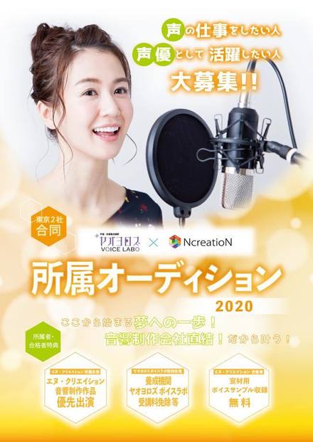 アニメ&音響制作会社直結の養成機関「ヤオヨロズ ボイスラボ」と、海外作品の吹替を中心に様々なコンテンツ制作に携わる制作会社「株式会社エヌ・クリエイション」が参加する東京2社合同オーディション!!