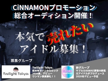 【主催】CiNNAMONプロモーション2020年に発足した発足したクリエイティブチーム CiNNAMONプロモーションでは、デビューを果たした「Twilight Tokyo.」「新グループ」のメンバーを募集している。