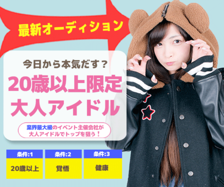 【主催】有限会社ライムライト大型アイドルイベントの主催や、ガールズ専門レーベルの運営、ライブハウス、アイドルカフェの管理や経営など数多くのアイドルに関する事業を展開しているライム・ライトでは、新たな「大人限定アイドルオーディション」を開催。エントリーを受け付けている。