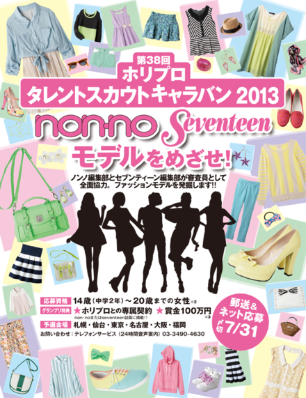 深田恭子、平山あや、綾瀬はるか、石原さとみなど人気スターを発掘してきた、大手プロダクション・ホリプロ主催の「ホリプロタレントスカウトキャラバン」。38回目を迎える今年のテーマは「モデル」。人気ファッション誌「ノンノ」「セブンティーン」が全面協力! グランプリはホリプロとの専属契約、賞金100万円に加え、「ノンノ」「セブンティーン」誌面で活躍できる。モデルからスターを目指したい人には見逃せないチャンスだ!